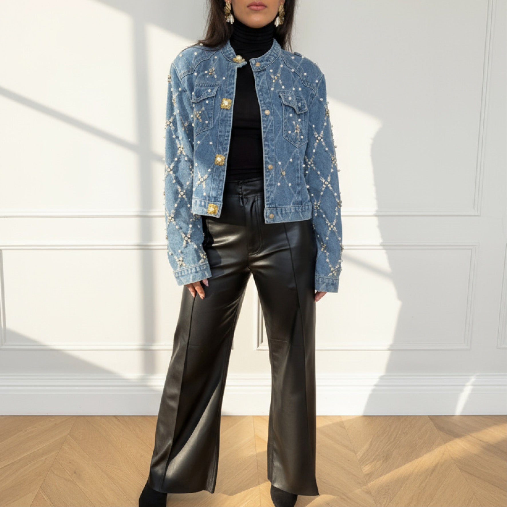Featuring soft denim fabric, embellished with pearls, beads and crystals, she is sure to be a head turner.
